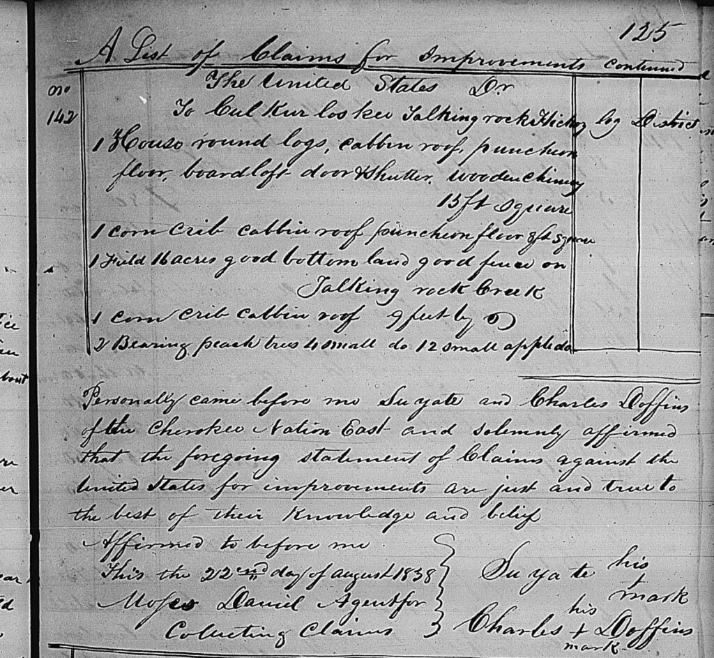 Personally came before me Su-ya-te and Charles Doffins of the Cherokee Nation East and solemnly affirmed that the foregoing statement of Claims against the United States for improvements are just and true to the best of their knowledge and belief