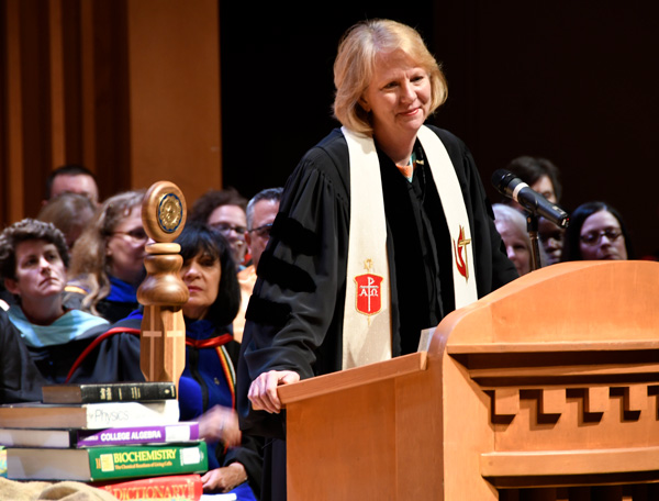 Bishop Sue Haupert-Johnson, episcopal leader of the North Georgia Conference of the United Methodist Church, delivered the sermon May 2 in Flint Hall at Falany Performing Arts Center, impressing upon students the importance of listening to God.