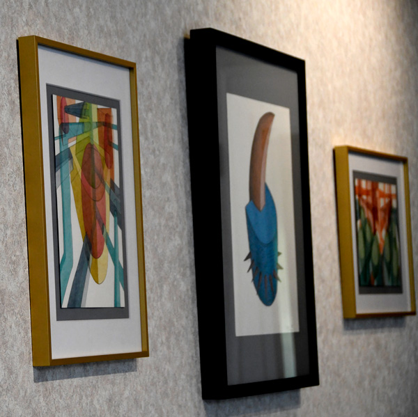 Another wall of the atrium is filled with work from drawings that incorporate graphite, watercolor paint and oil pastels completed by Mullinix.