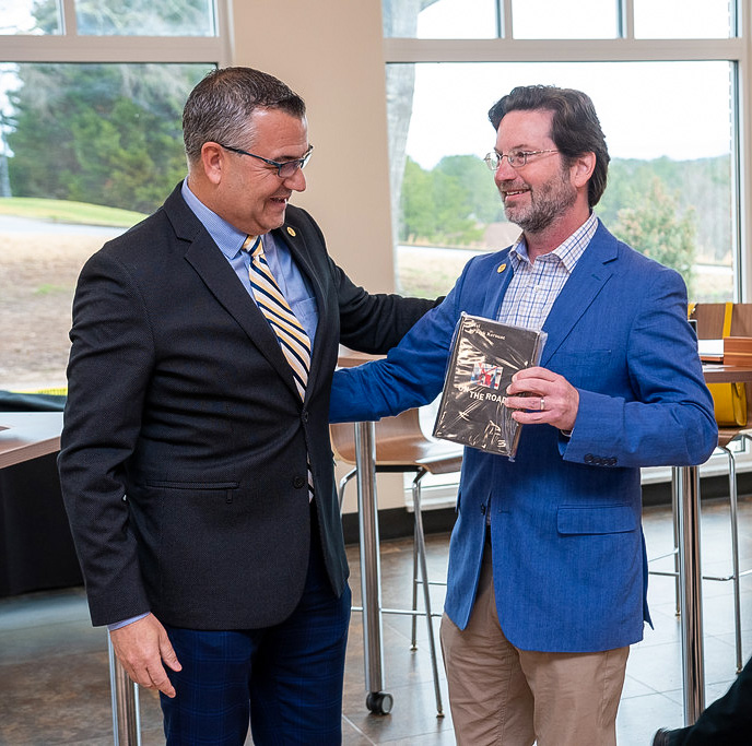 Representing Reinhardt’s faculty and staff, Bill Popp, vice president for enrollment management and athletics, presented Roberts with a 1957 first edition copy of “On the Road” by Jack Kerouac in a wooden box hand-made by Reinhardt’s very own Ray Marshall.
