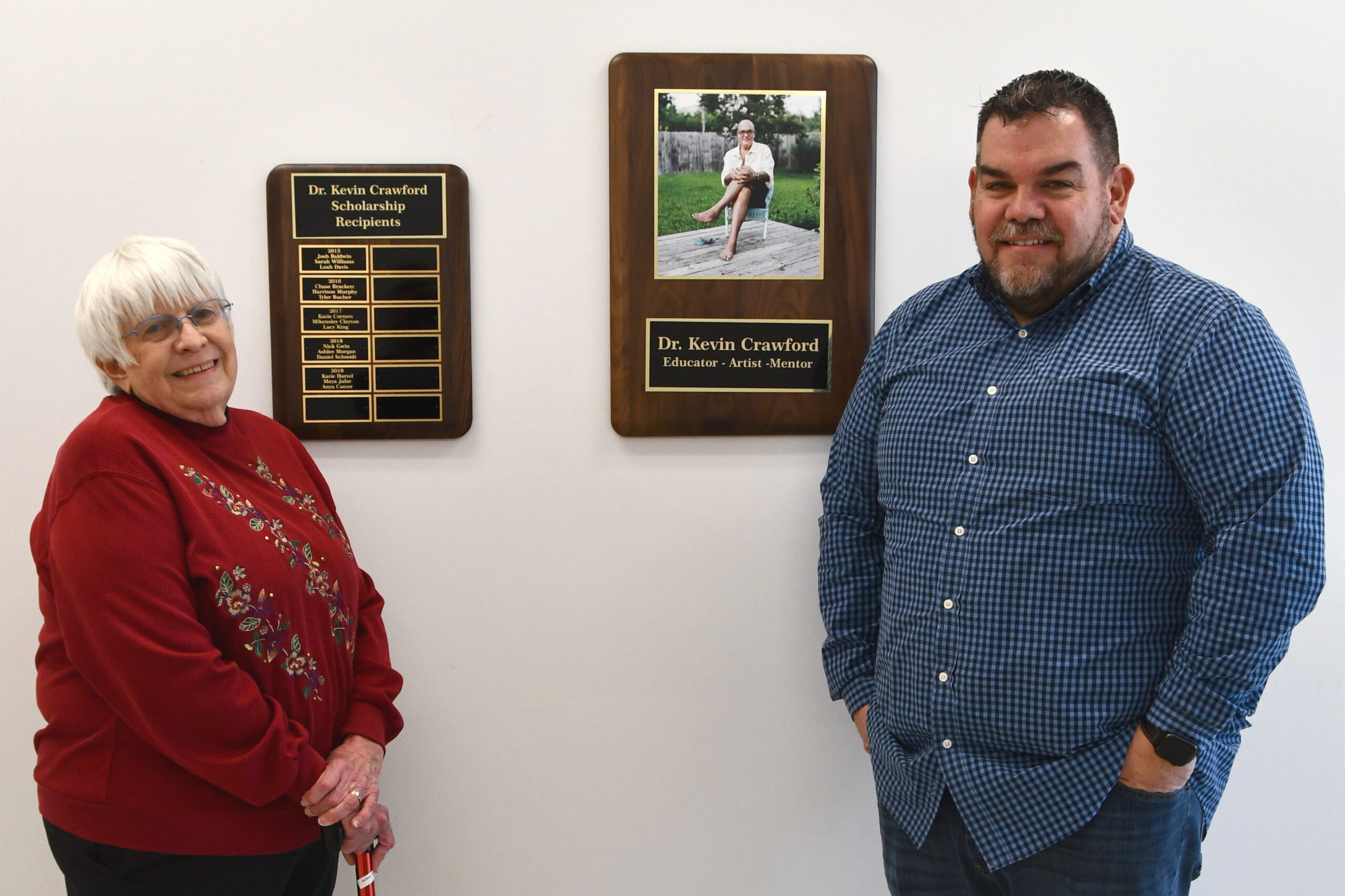 Following the annual scholarship luncheon, theatre director Dave Nisbet began giving Barbara and Todd Crawford a tour of Reinhardt University Theater. Around the corner from the front lobby they saw for the first time the newly installed plaques honoring their son and brother, the late Dr. Kevin Crawford.