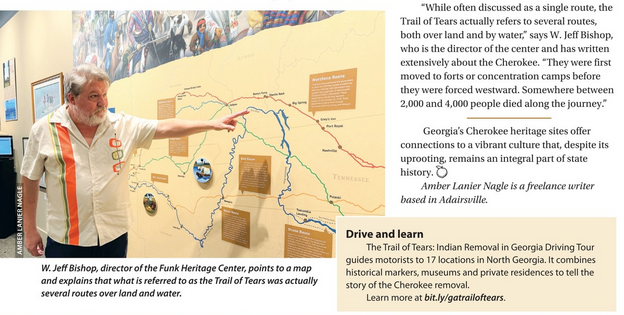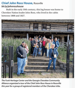 One of the article’s photos illustrates the connection between the sites and the Cherokee people. It shows members of the Cherokee tribe standing outside the historic Chief John Ross House in Rossville, Georgia. The Funk Heritage Center and Bennett History Museum helped organize their tour.