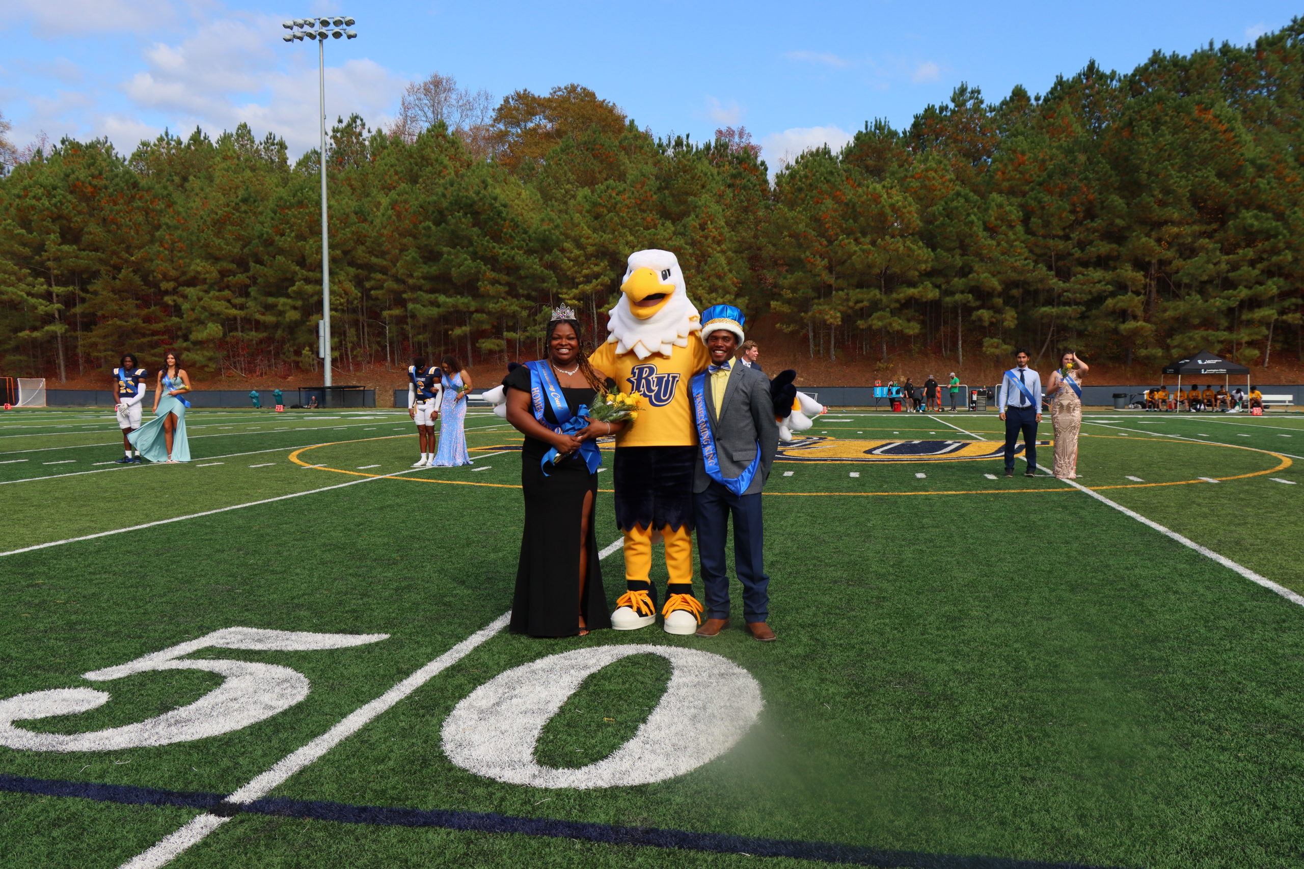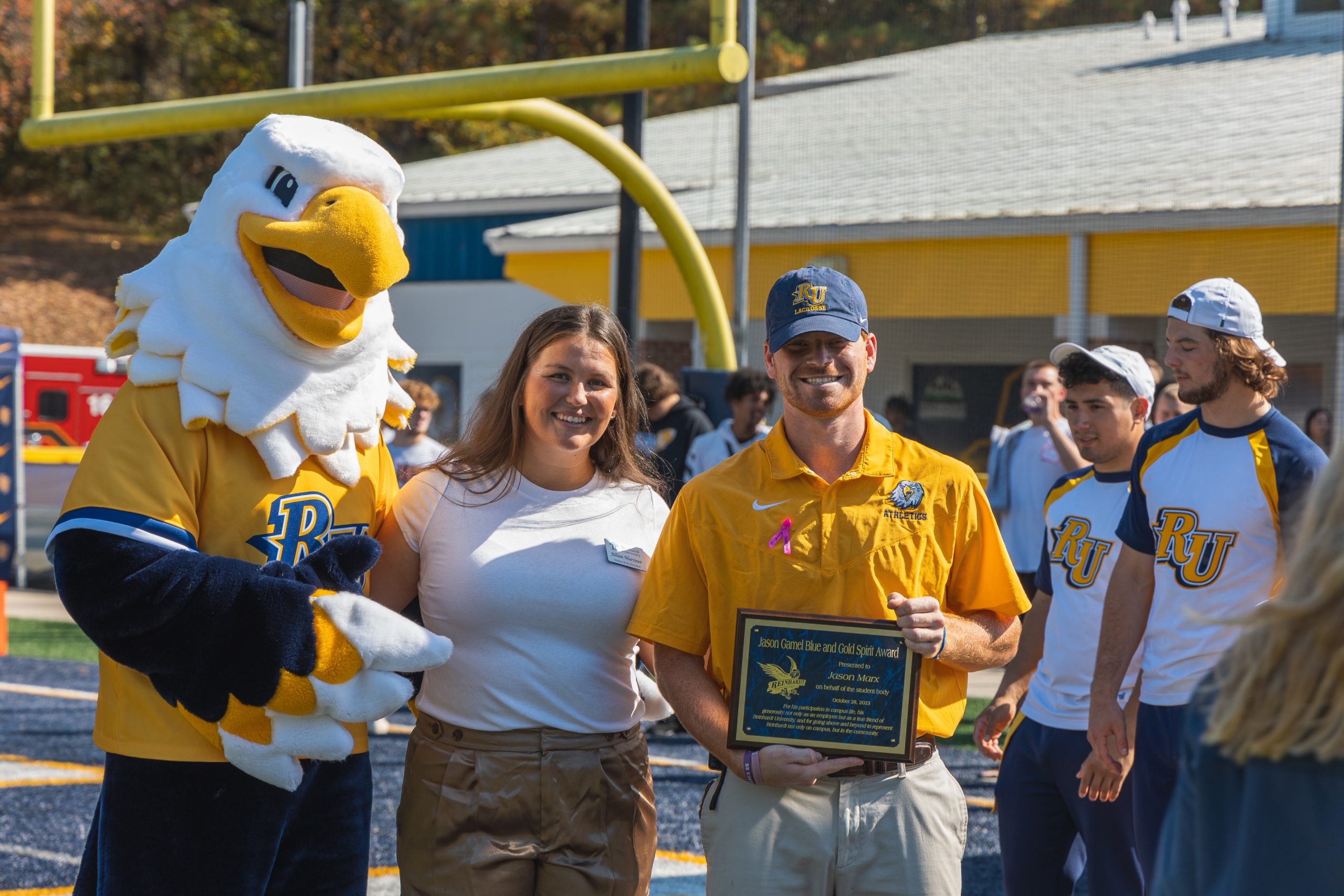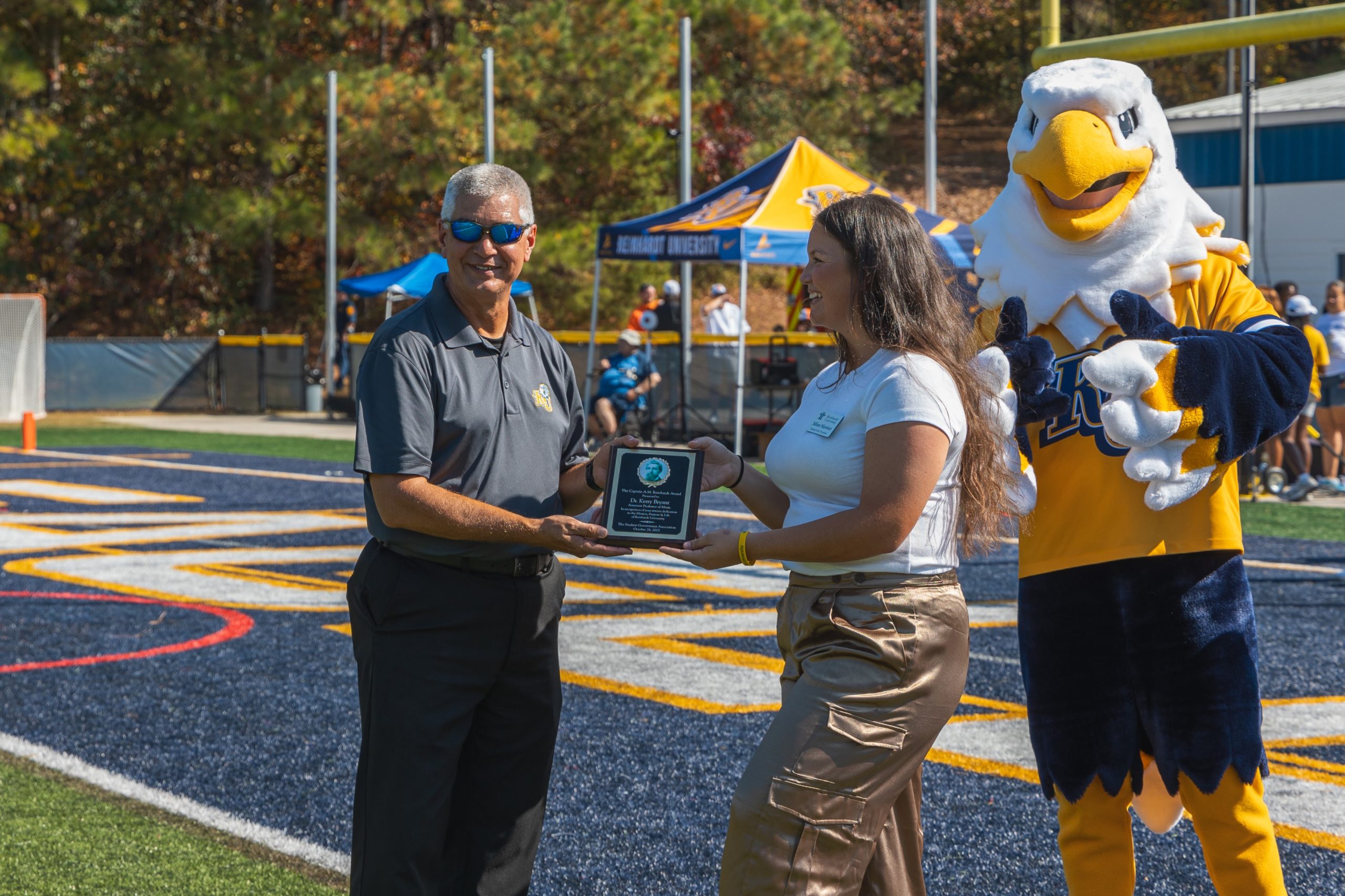 Two Reinhardt staff members were honored at Ken White Field, just before the football game. The Captain A.M. Reinhardt Award was presented to Dr. Kerry Bryant, Assistant Professor of Music. This award recognizes an outstanding individual who has demonstrated their devotion to the mission of the university. Jason Marx, Graduate Assistant for Student Affairs, received the Jason Gamel Blue and Gold Spirit Award for his representation of pride and zeal for Reinhardt. The Student Senate votes on the award recipients after a campus-wide nomination process.