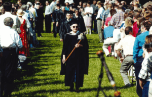 Professor Jane England leads a commencement procession. (Reinhardt University Archives)