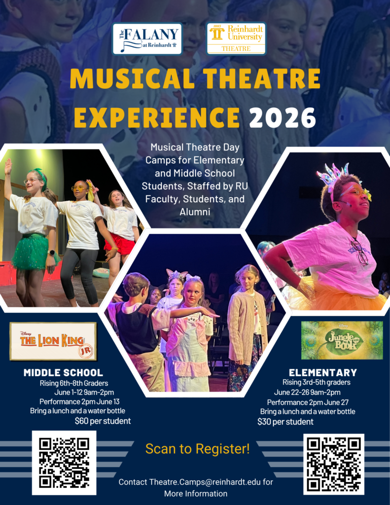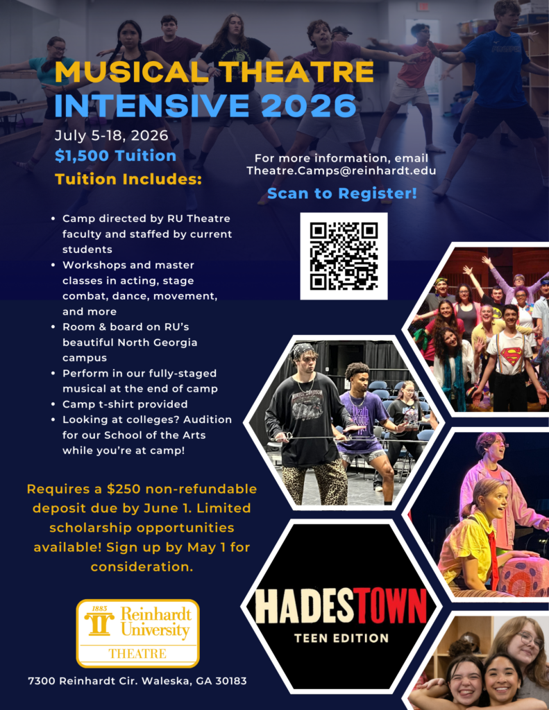 Reinhardt’s theatre program annually offers mentoring and talent development of area youth during summer break. Registration is now open for its 2026 Musical Theatre Summer Camps. The sessions include dance, voice, movement, and acting instruction, masterclasses, workshops, and rehearsals, culminating with performances.