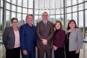 Northside Hospital Cherokee is continuing its longstanding support for Reinhardt University with a $500,000 gift for the University’s new School of Nursing and Health Sciences. Pictured in the Women’s Center Atrium at the new Northside Hospital Cherokee are, from left: Mary Jane O’Dell, education coordinator for Northside Hospital Cherokee, Billy Hasty, chair of the Reinhardt University Board of Trustees and a member of the Board of Directors of Northside Hospital Healthcare System, Billy Hayes, CEO of Northside Hospital Cherokee, Dr. Kina S. Mallard, president of Reinhardt University, and Dr. Glynis Blackard, dean of Reinhardt’s School of Nursing and Health Sciences. Photo by Darleen Prem