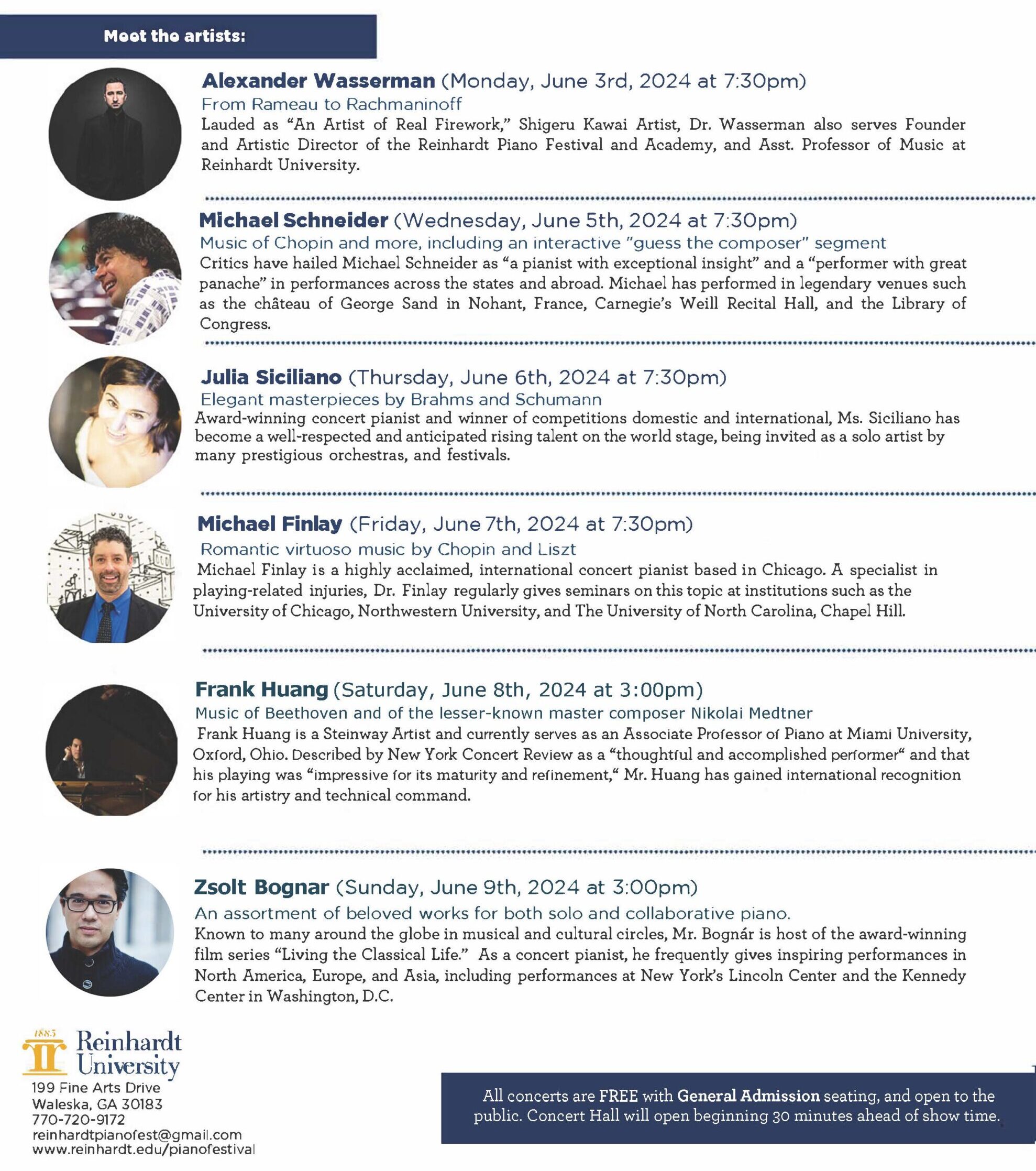 The Reinhardt Piano Festival and Academy is thrilled to announce the 2024 concert series at the Falany Performing Arts Center. This incredible opportunity features some of the finest pianists in the world. There is no charge for admission.