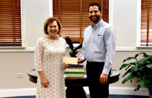 Dr. Kina Mallard accepts a gift to the University from National Resources Management, presented on behalf of the company by Director of Facilities Jeff Dale. Photo by Jordan Beach