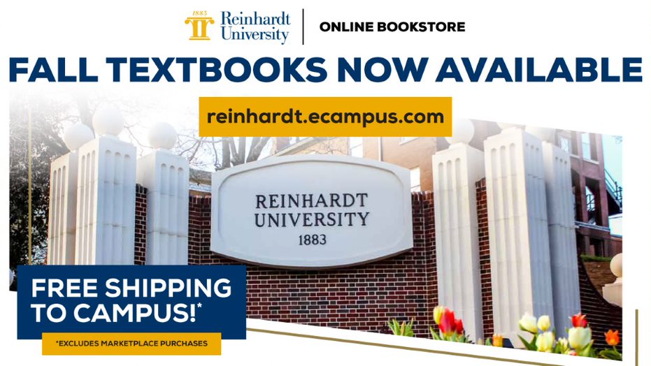 Replacing the current on-campus bookstore, Fall 2021 textbooks and course materials are available now be ordered online via Reinhardt.eCampus.com. Plans to add Reinhardt branded merchandise and other goods are in the works.