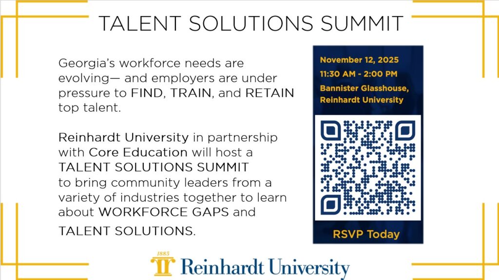 Reinhardt University’s Talent Solutions Summit brings together leaders, educators, and workforce innovators. The exclusive gathering takes place on November 12, 2025. Anyone is welcome to attend. Registration is required.
