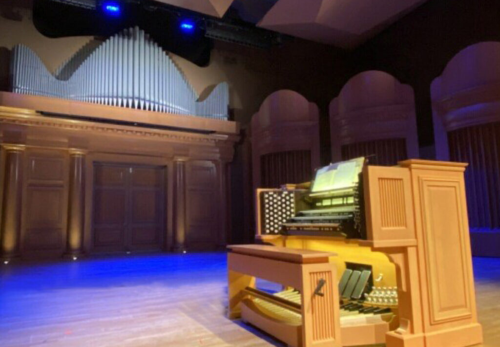 “The organ was custom built for Flint Hall by R.A. Colby, Inc., one of the leading organ builders in the United States,” says Fred Tarrant, Ph.D., dean of Reinhardt’s school of performing arts. The Colby team constructed the instrument in their Tennessee factory. Tarrant describes the organ as a “hybrid instrument,” using both the pipes traditionally associated with organs and digital enhancements. The principal pipes are visible above the stage, and there are multiple speakers in the chamber behind the pipes. “While the pipes are responsible for the main sounds characteristic of most organs, the digital enhancements bring to life the orchestral tone colors tailored specifically to the acoustics of Flint Hall. The result is a glorious instrument with virtually unlimited sound possibilities.”