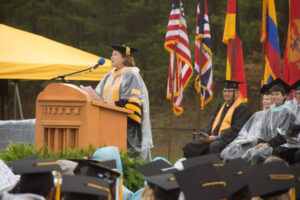 Reinhardt President Dr. Kina S. Mallard addresses the Class of 2017 at Ken White Field at University Stadium.