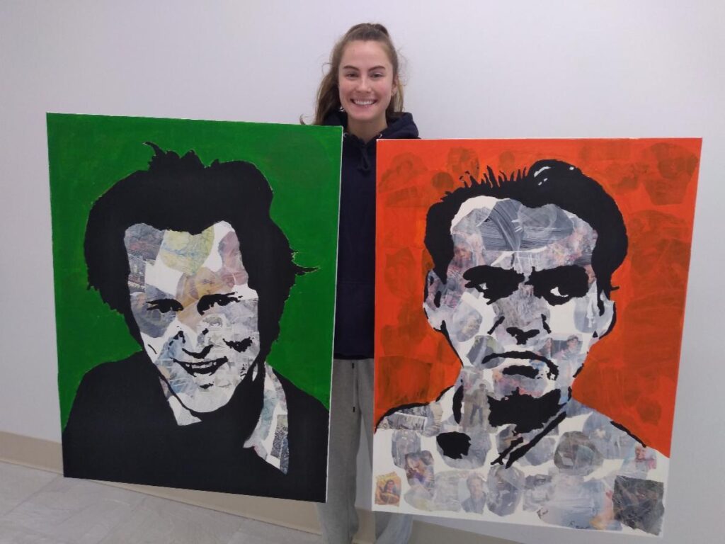 The core of this exhibit lies within the creative process of the portraits themselves. When explaining the process, Davis said, “I began this project as a way for students with limited art background to create decent looking portraits. It also involves designing the stencil in Photoshop, so students get a little digital art experience. I reference a few famous artists who use this technique in my class lectures, like Shepard Fairey. It is essentially a graffiti art (or street art) technique. Students collage the background of a canvas and then either spray or hand-paint a simple stencil design for a portrait.”