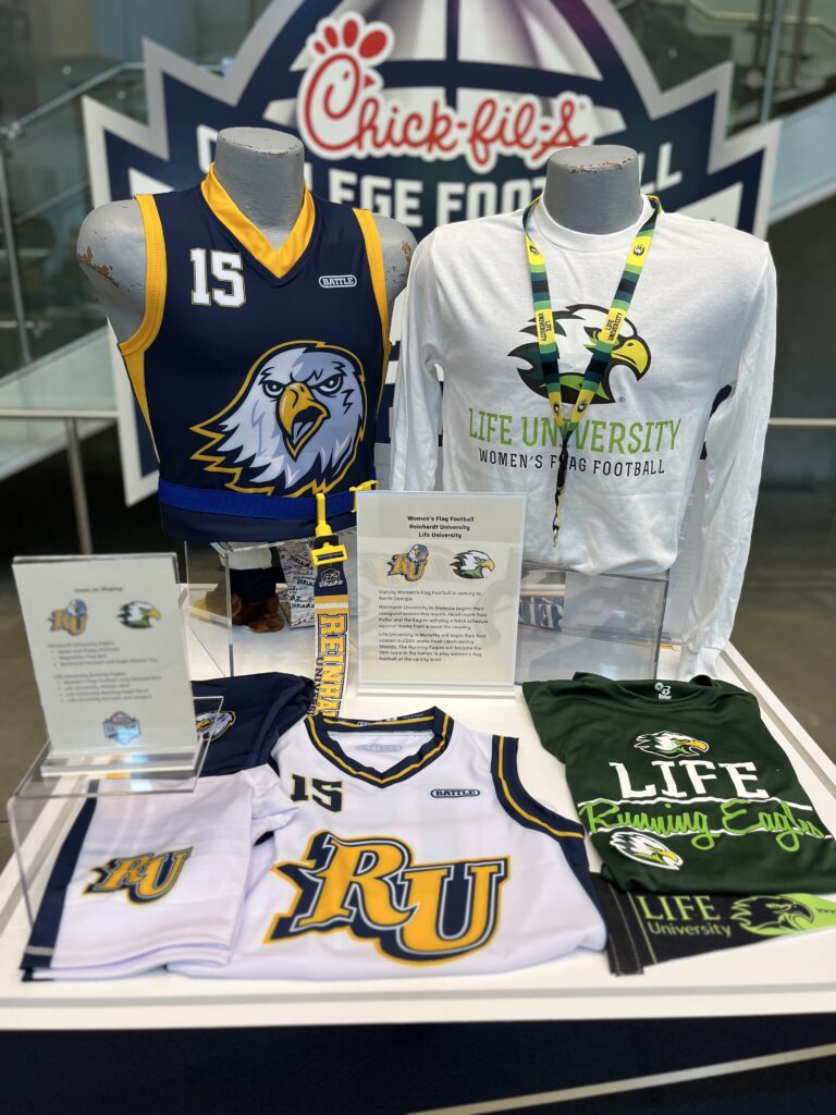 A complete Reinhardt flag football team uniform went on exhibit on March 1, 2023, at the entry of the College Football Hall of Fame in downtown Atlanta.